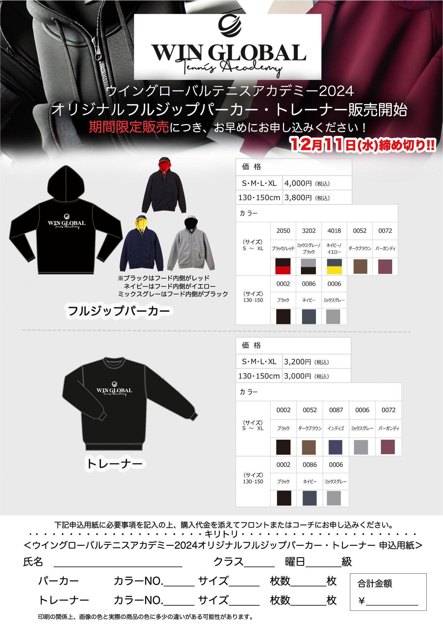 締め切りは12月11日(水)になりますので!!是非一緒に着てテニスをしましょう!!