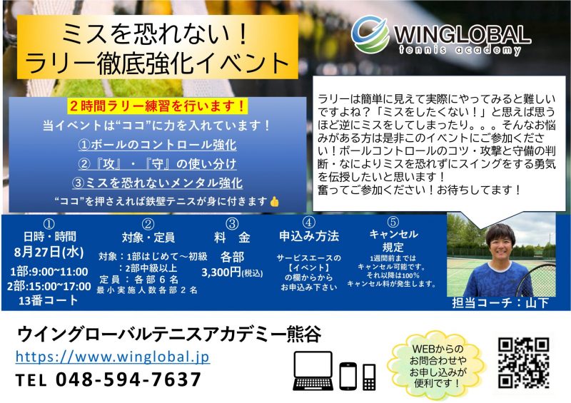 こんにちは! ウィングローバルテニスアカデミー熊谷の大柴です! 今回はイベント情報持ってまいりました!!...